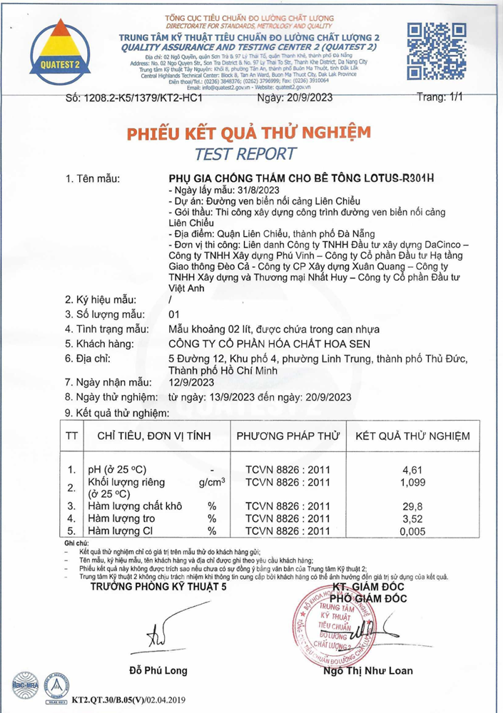 Lotus R301H là phụ gia siêu dẻo gốc Polymer thế hệ thứ 3 với khả năng giảm nước cao cấp; được bổ sung hệ tinh thể rỗng giúp cắt hiệu quả các mao mạch trong bê tông nên có khả năng chống thấm hiệu quả; đồng thời tăng tính linh động, giúp tạo cường độ sớm khả năng công tác của bê tông.